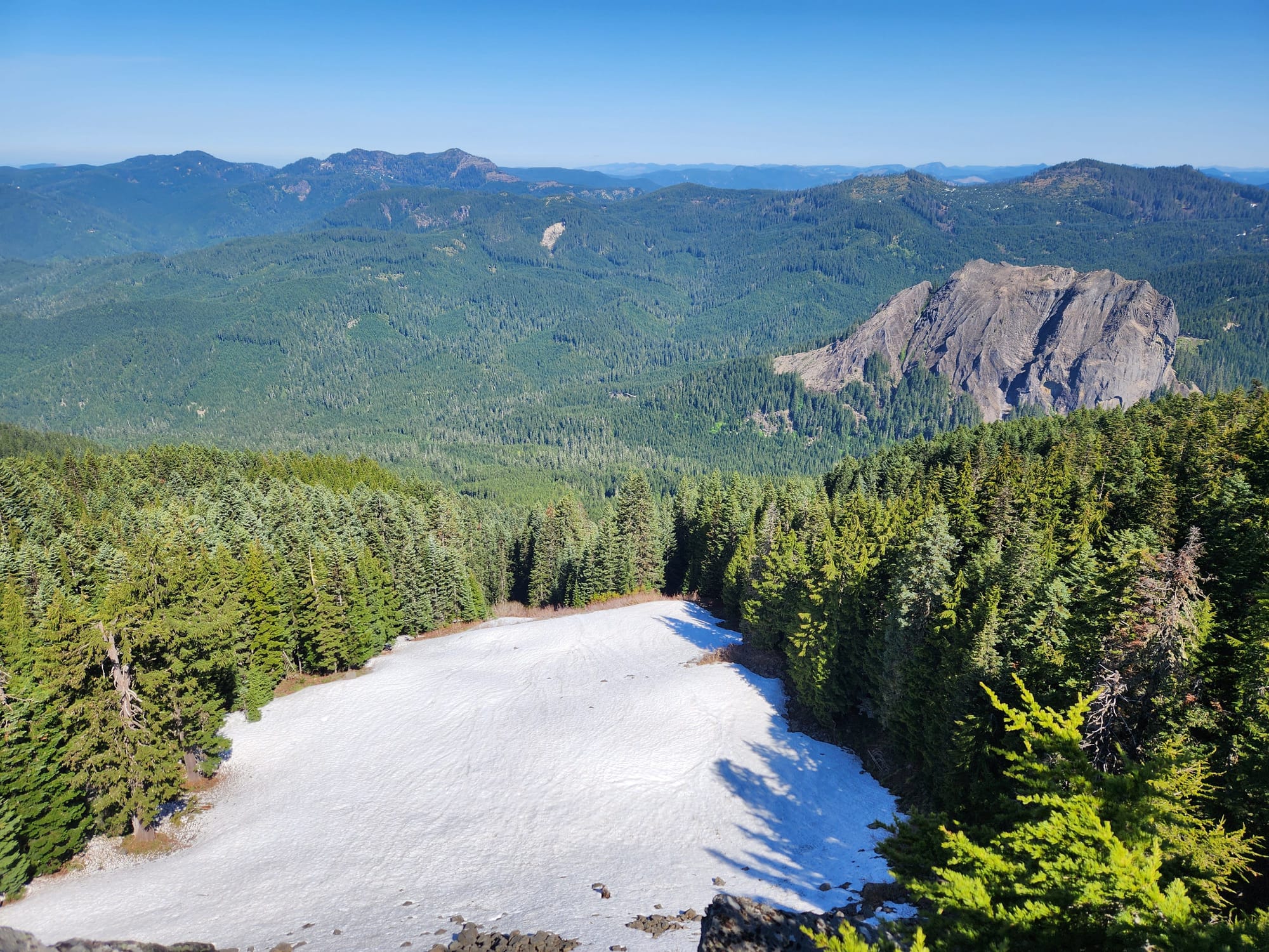 I climbed easily, hit a switchback in the trees, and then saw the lookout, perched atop a block of basalt. From below, it looks fortress-like. The trail wound around the base and then up through the rocks. The last few feet were not much more than a scramble. Greeting me was an office chair without a back, the origin story of which I’ve wondered about (and invented) ever since.